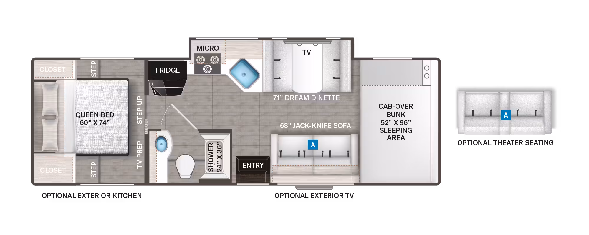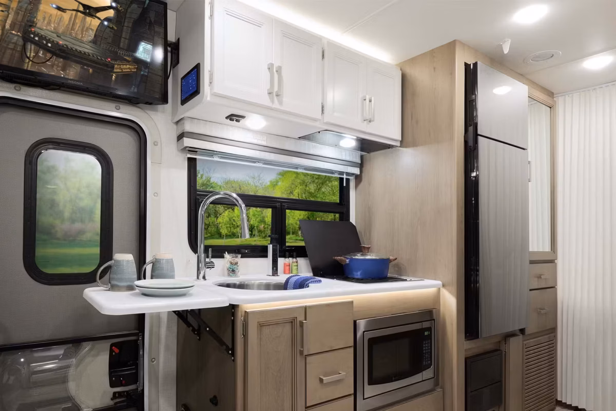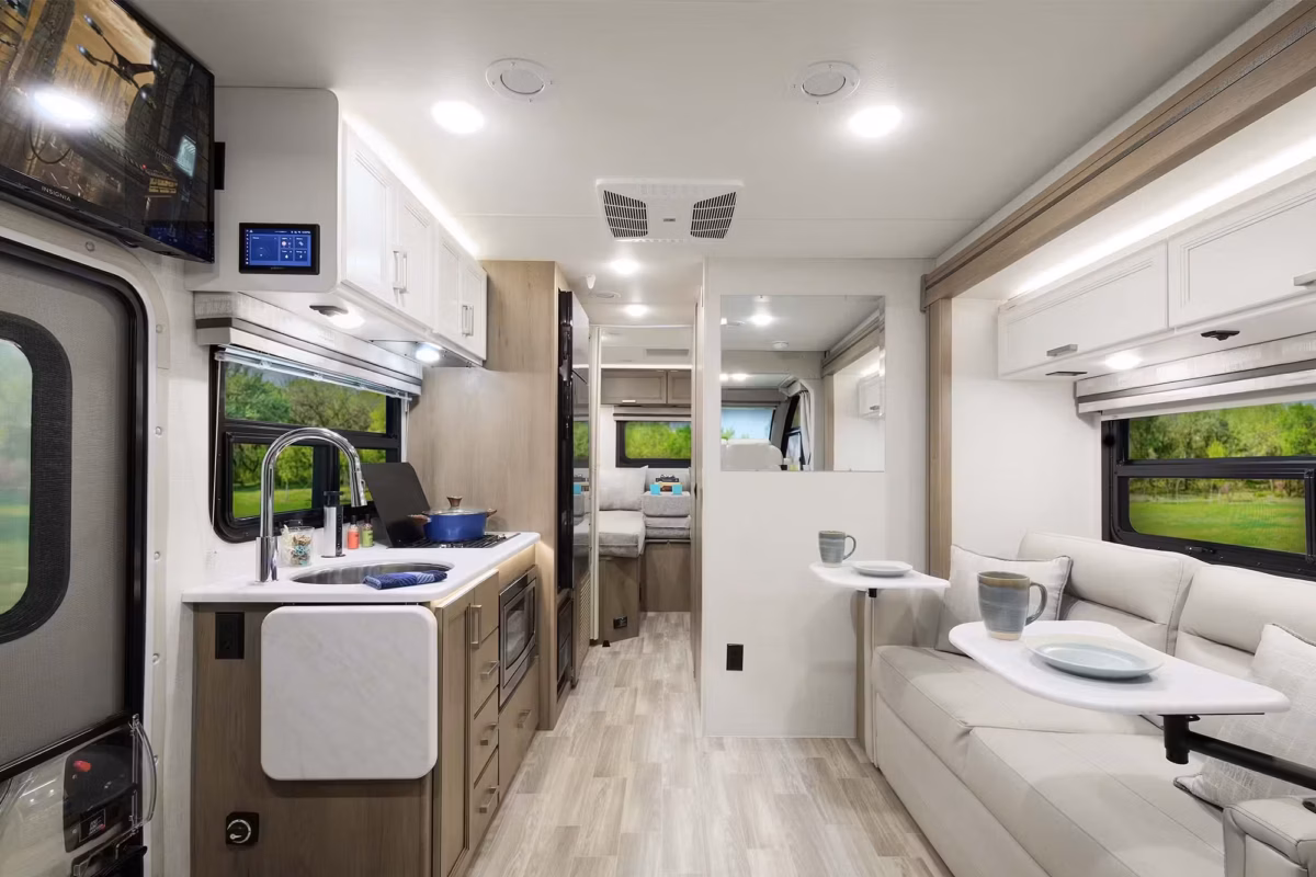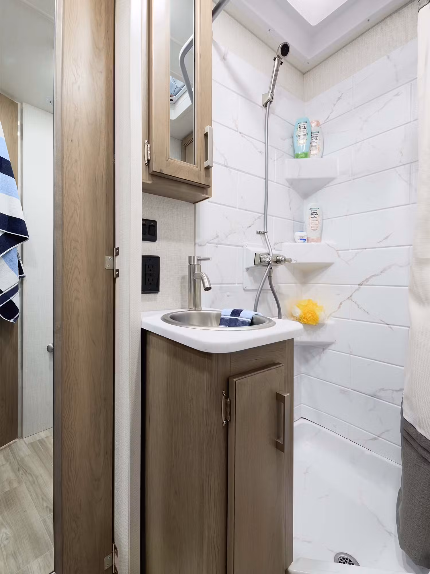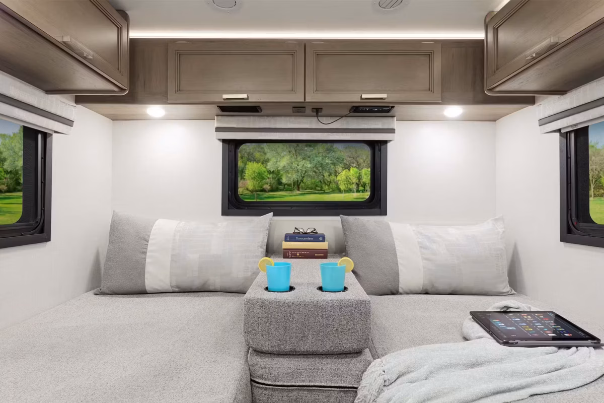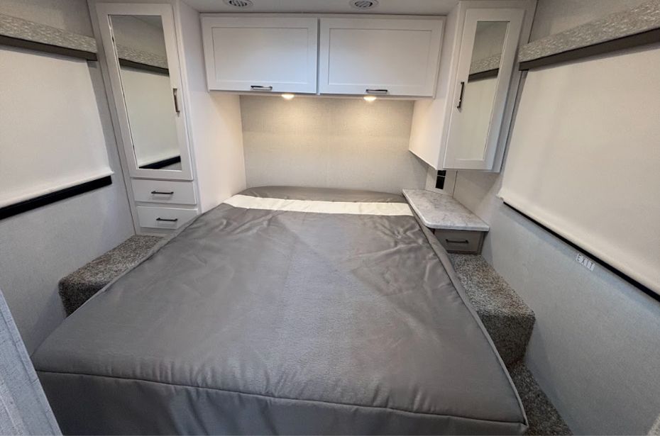 Select this RV for intimate gatherings and families of up to five. As our most compact unit, it features three comfortable sleeping areas, a full bathroom, and a master bedroom with a convenient slide-out. At just 25 feet long, this RV is the easiest to drive and maneuver, making your adventures a breeze.